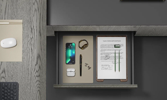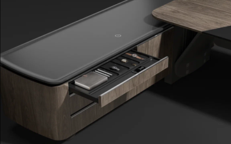 Современный стол руководителя оснащаются множеством скрытых пеналов, ящичков и ниш для хранения личных и ценных вещей. Зачастую контроль открытия производится посредством карты, через биометрические данные или приложение.