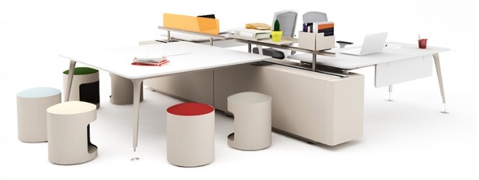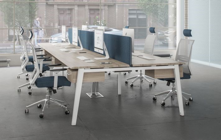 В зависимости от типа планировки и дизайна офиса рабочие столы могут быть на одно рабочее место или в виде бенч-системы, объединяющей несколько столов в единые кластеры на 2, 4, 6 и более рабочих мест.