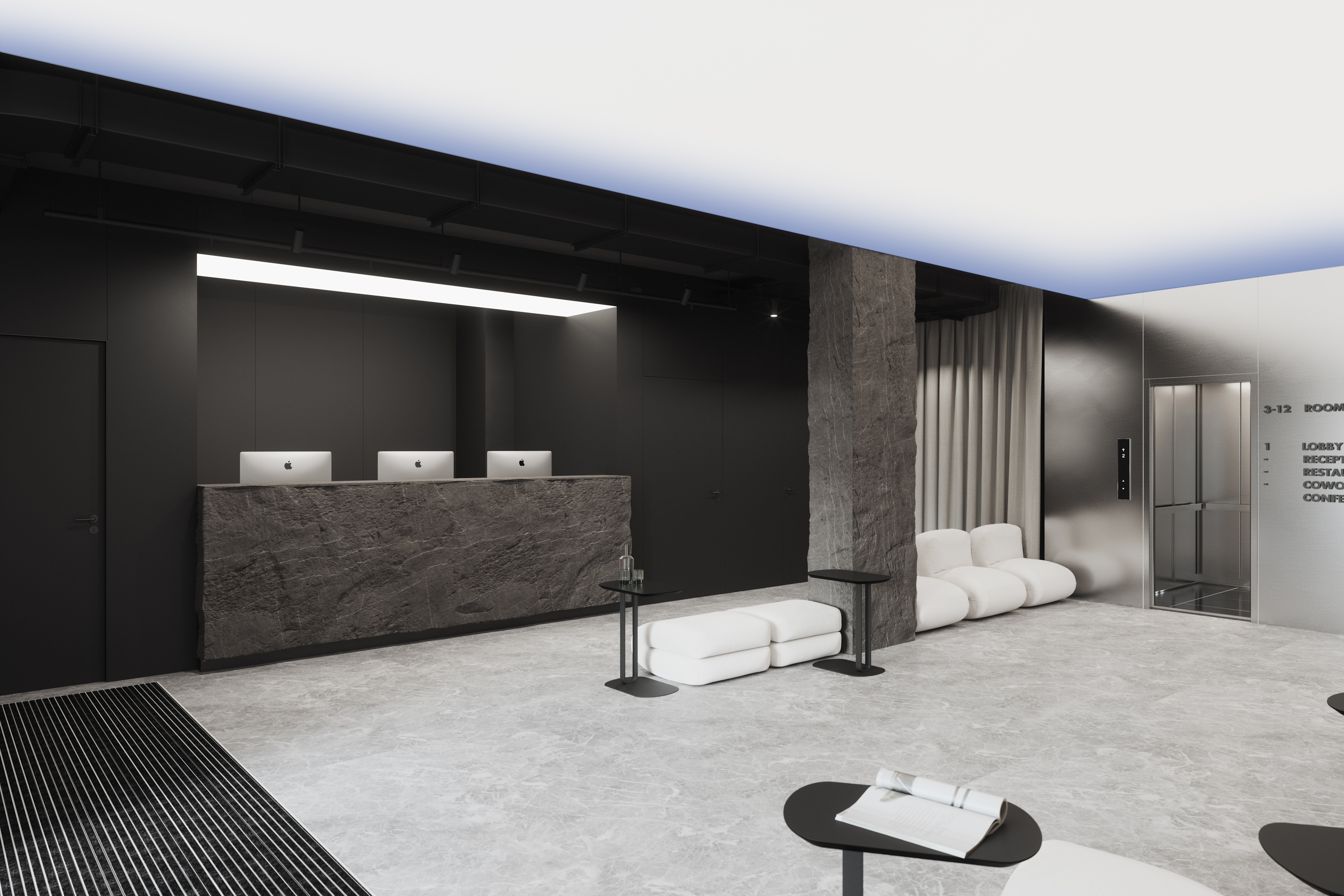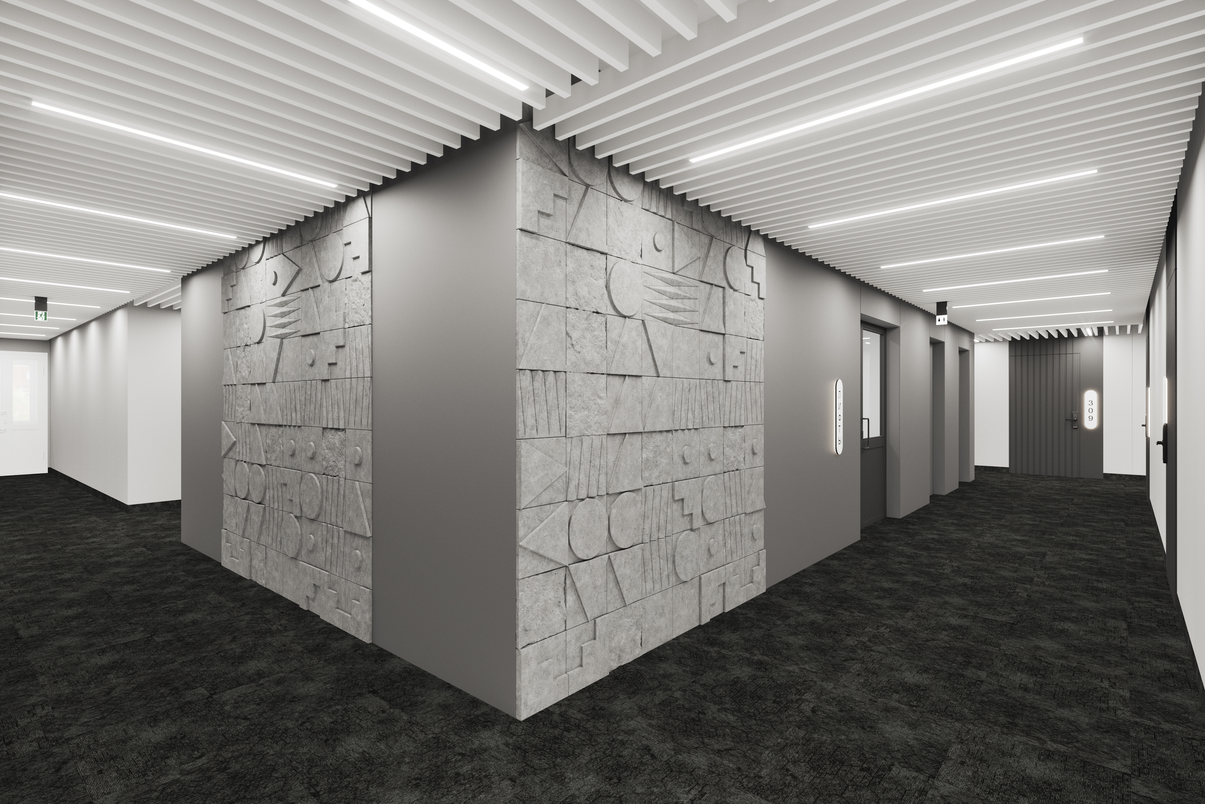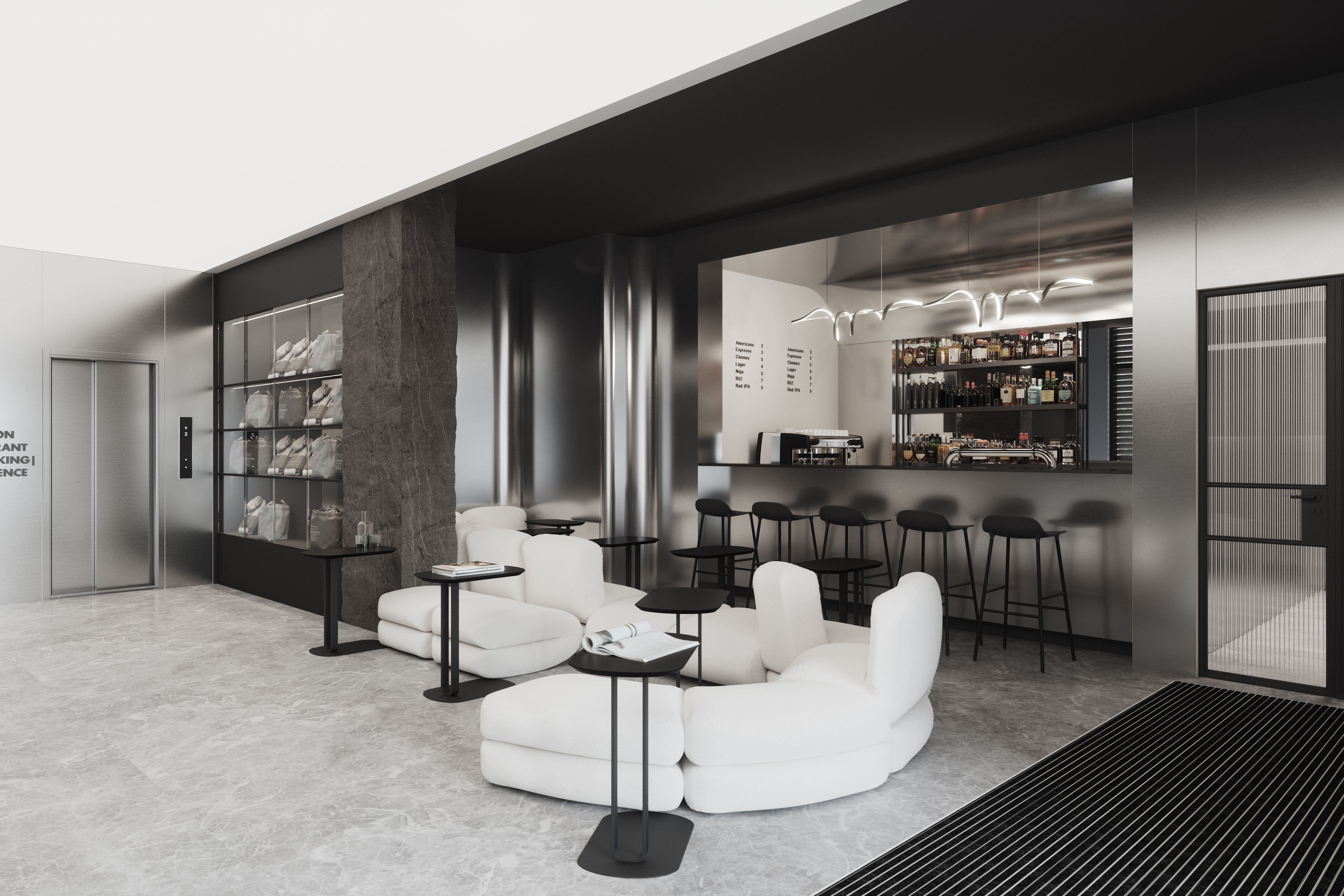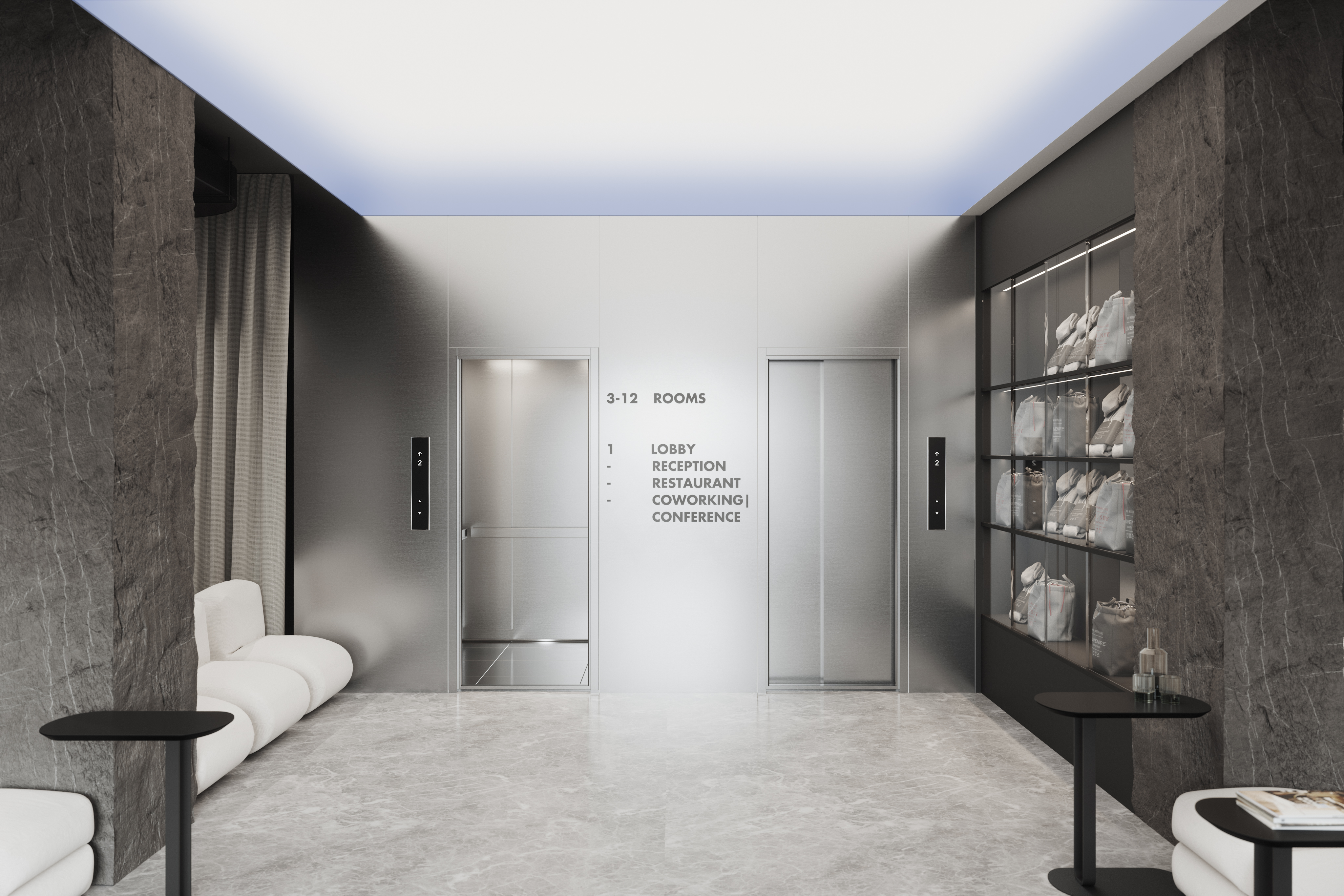 Выполнение лифтовой и барной зоны из панелей ornamita под металл, отделка колонн из искусственного камня. В данном проекте транслируется концепция природных явлений, направленных на поддержание натуральных материалов, таких как: шлифованная сталь, бетон, рифленое стекло, дерево.